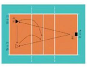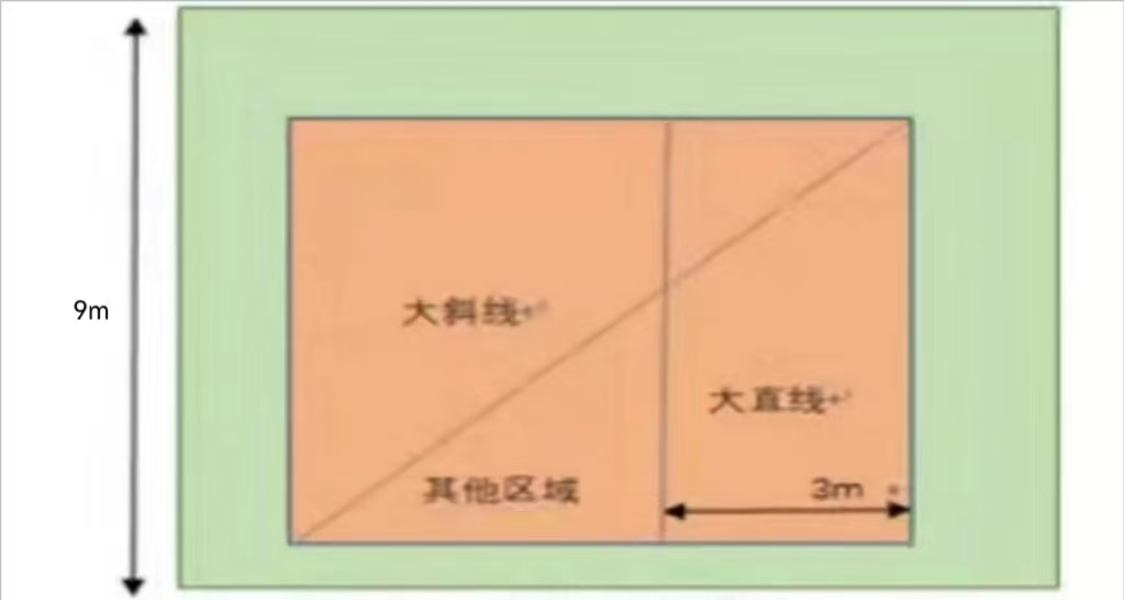 如图9所示,在侧边线与中线和三米线形成一个4.5×3米的长方形区域,在距离三米线1米处,画一条平行于4.5米线的直线,将长方形区域分成A、B两部分。靠球网部分为A区(2×4.5米),靠三米线部分为B区(1×4.5米)。