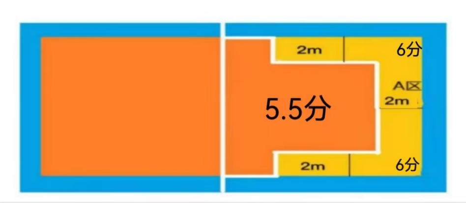 评分标准:发球落点进入A区(进攻线后距离两边边线内2米,距离端线内2米的区域)包括压线,得6分;进入场地其他区域得5.5分;发球失误或犯规不得分。如图7所示。