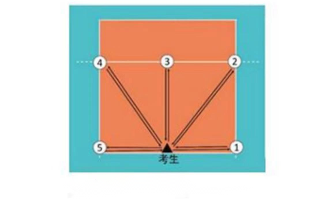 考试方法:考生面向球网,从起点(端线中点)起动,计时开始,先向1号点移动,击倒1号点标志物后,应立即返回起点并击倒起点处标志物,再向2号点移动,以此类推,直到击倒5号点标志物回到端线中点(须将每个标志物击倒,否则不计成绩),计时停止,记录完成的时间。每人测试2次,取最好成绩。如图6所示。