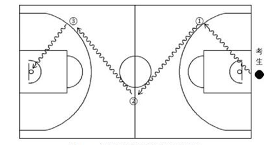 考试方法:如图2所示,考生在球场端线中点外出发区持球站立,当其身体任意部位穿过端线外沿的垂直面时开始计时。考生用右手运球至①处,在①处做右手背后运球,换左手向②处运球,至②处做左手后转身运球,换右手运球至③处,在③处做右手胯下运球后右手上篮。球中篮后方可用左手运球返回③处,在③处做左手背后运球,换右手向②处运球,在②处做右手后转身运球,换左手向①处运球,在①处做左手胯下运球后左手上篮。球中后做同样的动作再重复一次,上篮未中需补篮至命中,共需投中4个球,最后一次命中后,持球冲出端线,考生身体任意部位穿过端线外沿垂直面时停止计时,记录完成的时间。每人可测试2次,取最好成绩。