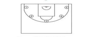 考试方法:如图1所示,在以篮圈中心投影点为圆心,5.5米为半径所划的弧线上设置五个投篮点(球场两侧0度角处、两侧45度处和正面弧顶),每个点位放置5个球,共25个球。考生须从第1投篮点或第5投篮点开始投篮,按逆时针或顺时针方向依次投完每个点位的5个球。测试时间为90秒。要求考生必须在弧线外投篮,球出手前双脚不得踩线,若踩线投中则计为无效投篮,不得分。也可以选择全部投三分,以三分线为界,其他方法同上。每人可测试2次,取最好成绩。