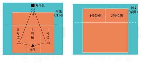 考试方法:考生可在发球区内任意位置连续发球5次,每次发球根据落点区域的不同获得相应的分数(取4次发球最高得分为最终成绩)。